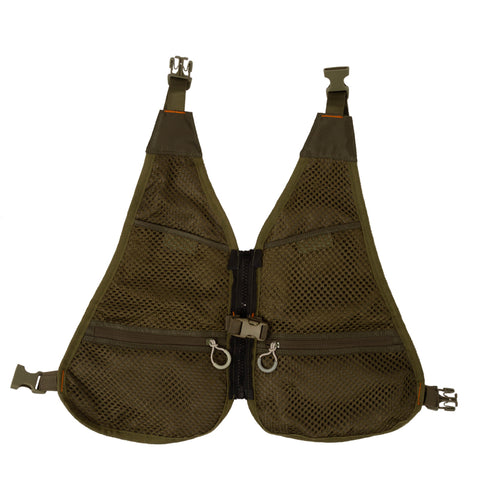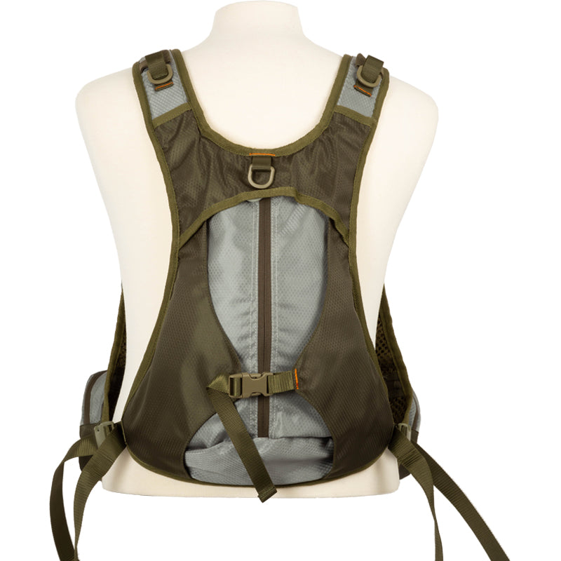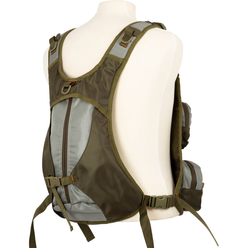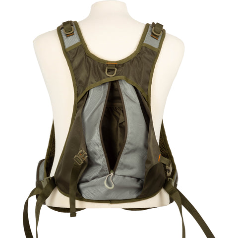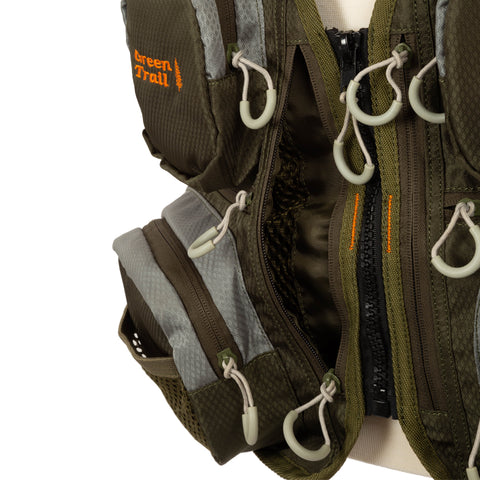 Several pockets with zippers in the front with a bag on the back. Adjustable shoulder and waist straps. “D” ring to hang a landing net.